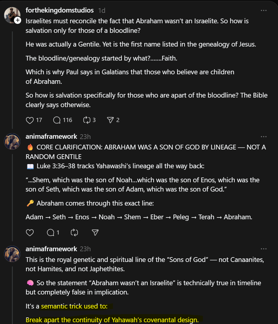 Bartie Musa Commentary: What prompted this article was this unlearned individual below on threads spewing typical Christian nonsense. He was making it seem like Abraham was just some random heathen who Yahawah just happened to pick. Completely missing the entire narrative, Abraham was a descendant of the sons of God, the sons of Yahawah. The scriptures traces his direct lineage from Adam to Abraham to Christ Yahawashi himself, The entire scriptures is about the ONE chosen seed line which is the sons of God, who later became known as the Israelites. To say that Abraham was not an Israelite is correct, because Jacob wasn’t even born yet so of course he was not. Abraham was part of the sons of Yahawah, the sons of God. The sons of God lineages continued THROUGH him (Abraham) unto Isaac, and unto Jacob who’s name was changed to Israel. It’s still the same lineage, it’s really not that complicated. However these are the mental gymnastics you have to make as an unlearned reprobate in order to divorce Yahawah from HIS people.