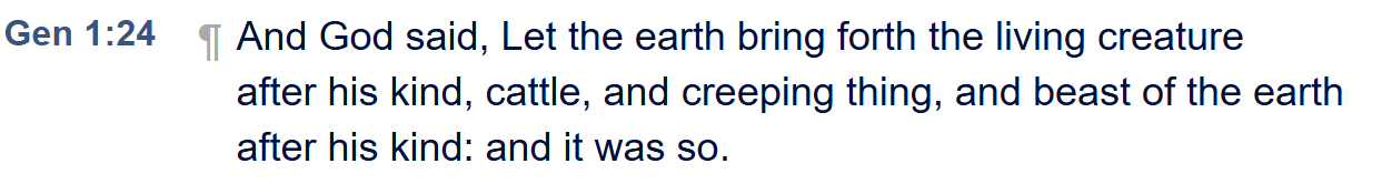 “Let the earth bring forth the living creature after his kind, cattle, and creeping thing, and beast of the earth after his kind: and it was so.” — Genesis 1:24