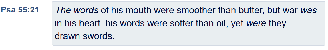 📖 Psalm 55:21 — “The words of his mouth were smoother than butter, but war was in his heart: his words were softer than oil, yet were they drawn swords.”