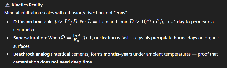 Mineral infiltration scales with diffusion/advection, not “eons”: