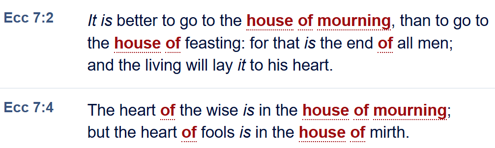 Ecclesiastes 7:2 — “It is better to go to the house of mourning, than to go to the house of feasting: for that is the end of all men; and the living will lay it to his heart.”