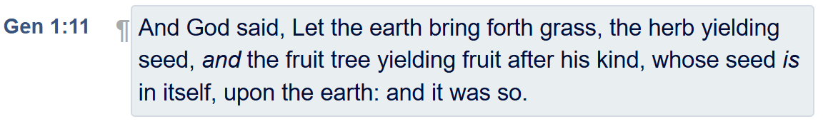 - Genesis 1:11–12 — “And God said, Let the earth bring forth grass, the herb yielding seed… and it was so.”